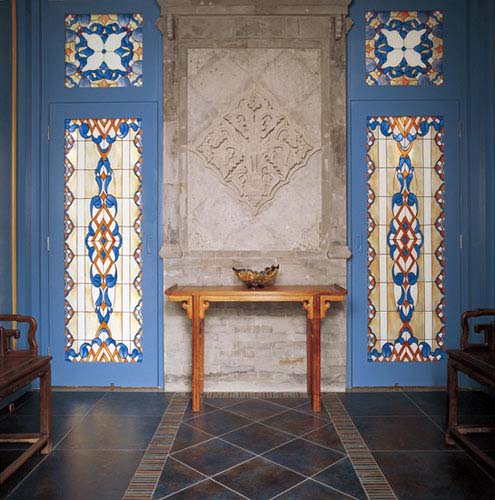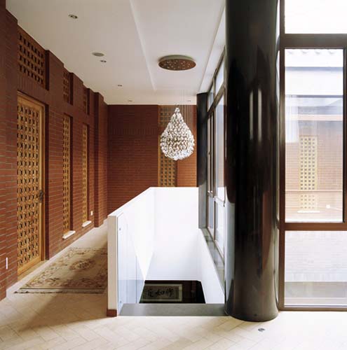 門廳工整考究,打開大門,迎面是傳統(tǒng)的灰磚與玲瓏剔透的玻璃磚形成的玄關(guān)。