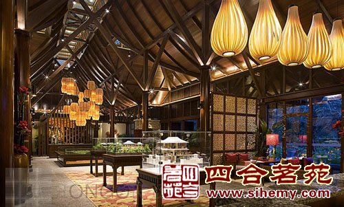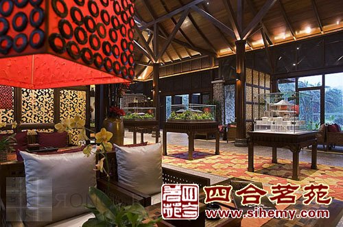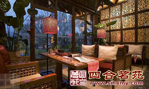 沒(méi)有奢華的描金彩繪但是傳統(tǒng)的木結(jié)構(gòu)和中式的花格燈飾自然之美更加吸引觀者的目光,設(shè)計(jì)色彩簡(jiǎn)單但不單調(diào)奢華的氣氛充盈了整個(gè)空間。