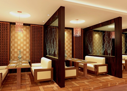 第二、隔斷應用。在酒店裝修設計中隔斷的應用目的不是在于空間切斷,然而它是一個過渡,一個提醒、一個指示,常常“隔而不斷”。碧紗櫥、落地罩、飛罩、屏風、博古架、帷幕,不但用來“隔而不斷”,還有很強的裝飾性。例如中央采用透空木隔斷,形成豐富的環境視覺效果。兩旁附以玻璃做的矮架。在分隔座椅時,又采用木制和玻璃的隔斷體現了豐富的層次感。